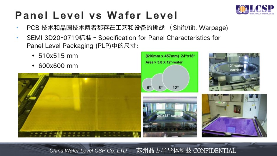 与晶圆级封装(WLP)不同,板级扇出封装(PLP)在圆形尺寸上向更大面积的长方形尺寸拓展,以获得更优的性价比。根据基板材料来分可以归为三类:有机物基板、硅基板、玻璃基板。板级封装工艺流程与晶圆级封装本身没有太大差异,但是需要独立开发生产设备及相应系统。板级封装和晶圆技术两者都存在工艺和设备的挑战,主要是材料CTE造成的应力引起的基板翘曲,以及系统散热等方面问题。板级封装借鉴了很多PCB技术,可以实现多芯片的灵活布局,相比于晶圆级封装更具成本优势潜力。不过,这一领域相关的工艺开发,设备和材料,测试和设计仿真等都有待解决。